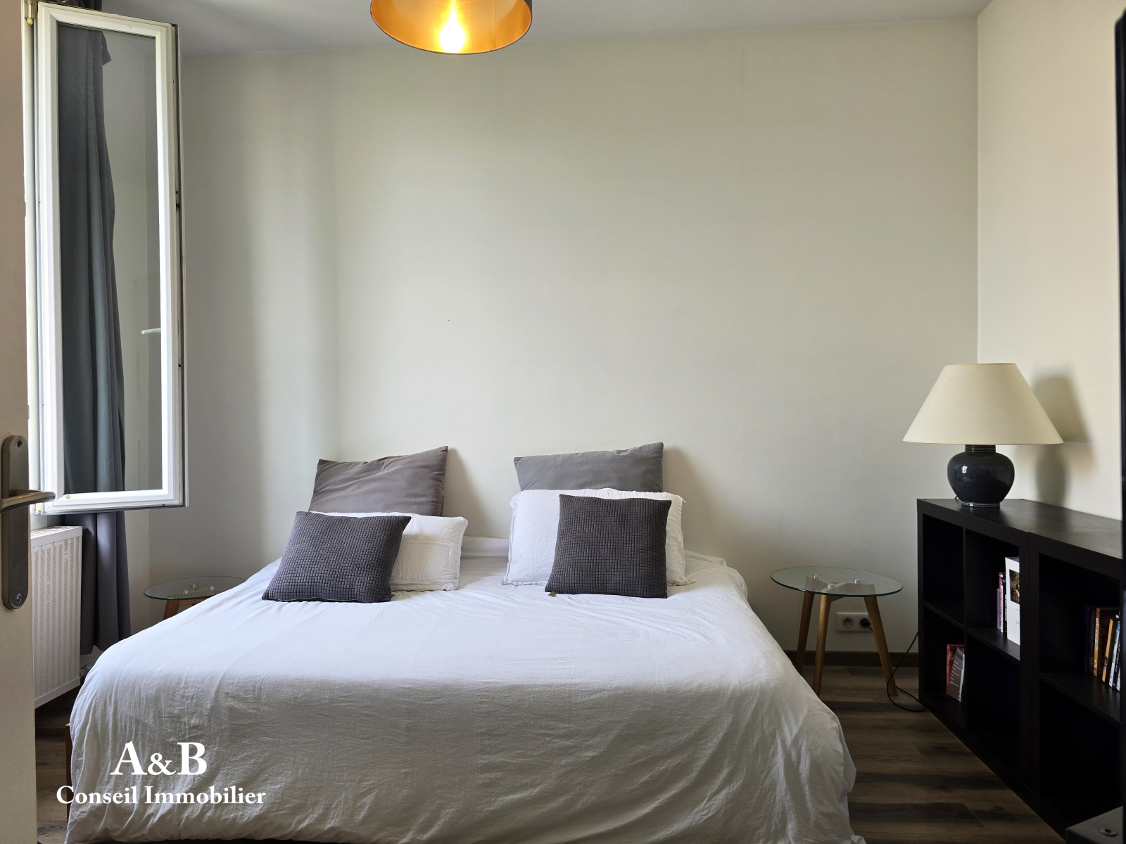 Pièce de vie lumineuse, salon avec cheminée, cuisine aménagée donnant sur un joli balcon-terrasse sans vis à vis, salle d'eau et wc.