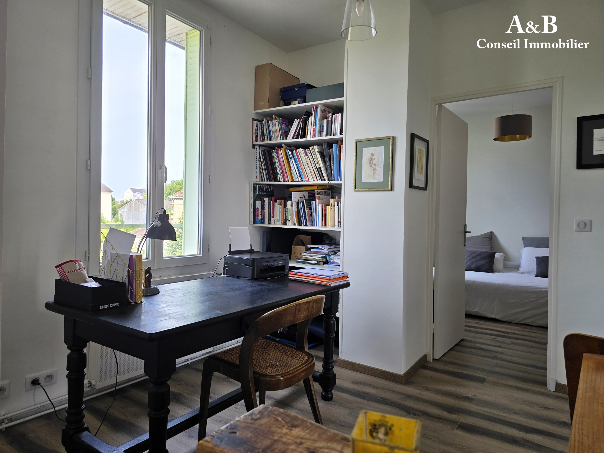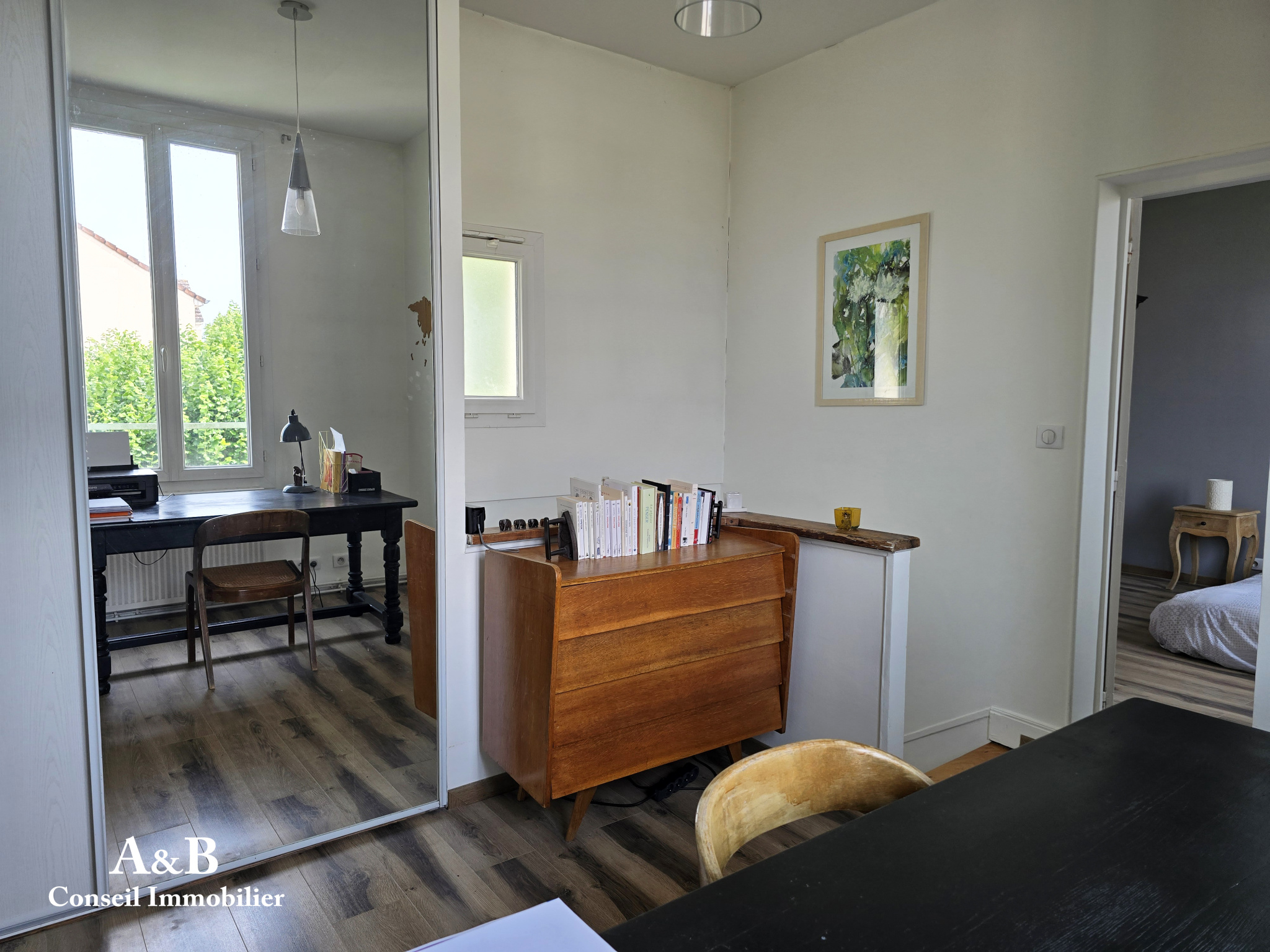 Au premier étage un palier à usage de bureau (possibilité de créer une salle d'eau supplémentaire) dessert un wc et deux chambres très lumineuses de 12m² et 14m².
