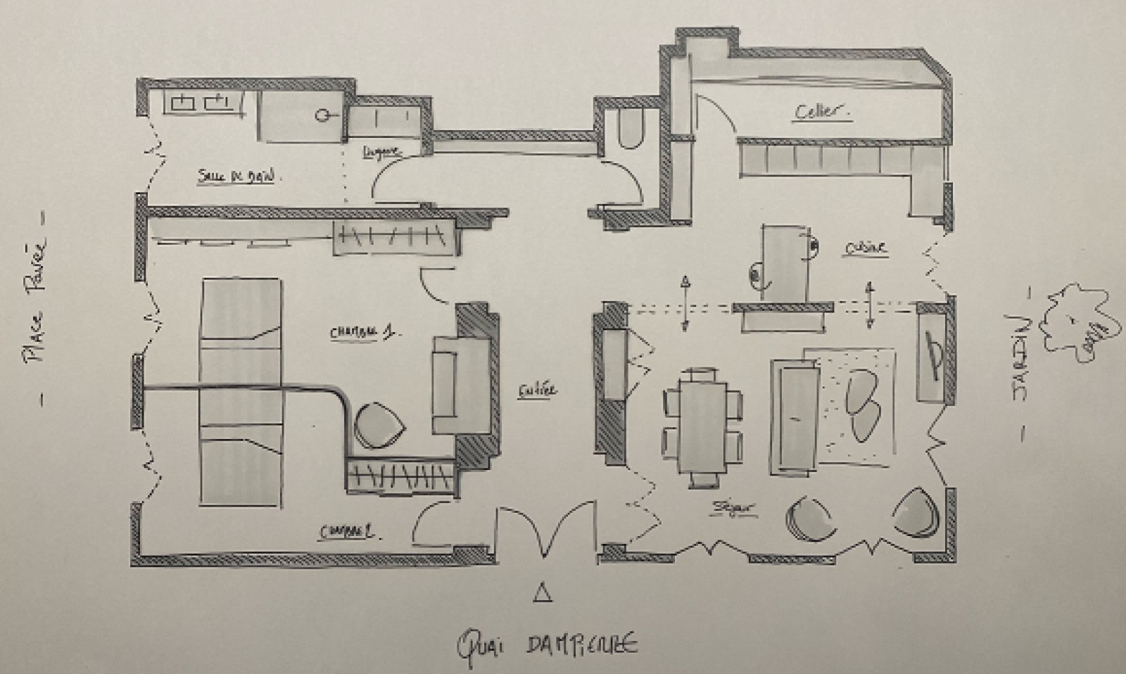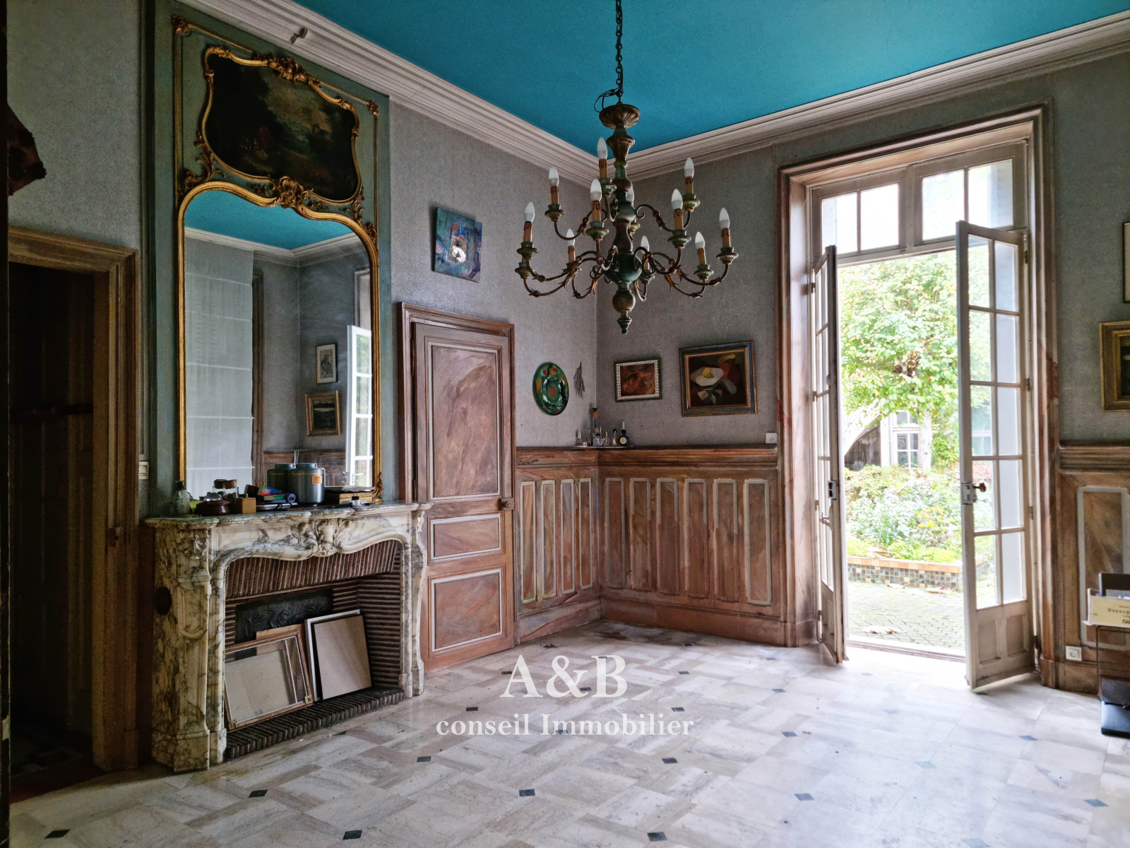 Entrée spectaculaire ayant conservé son charme d'origine et desservant deux pièces de 31m² et 22m2 dont l'une offre un accès direct sur le jardin. Bureau de 9m².