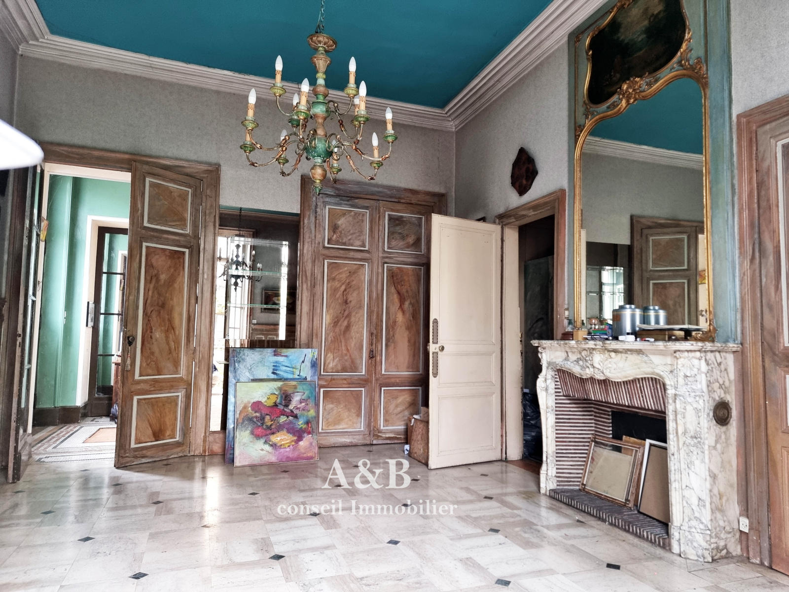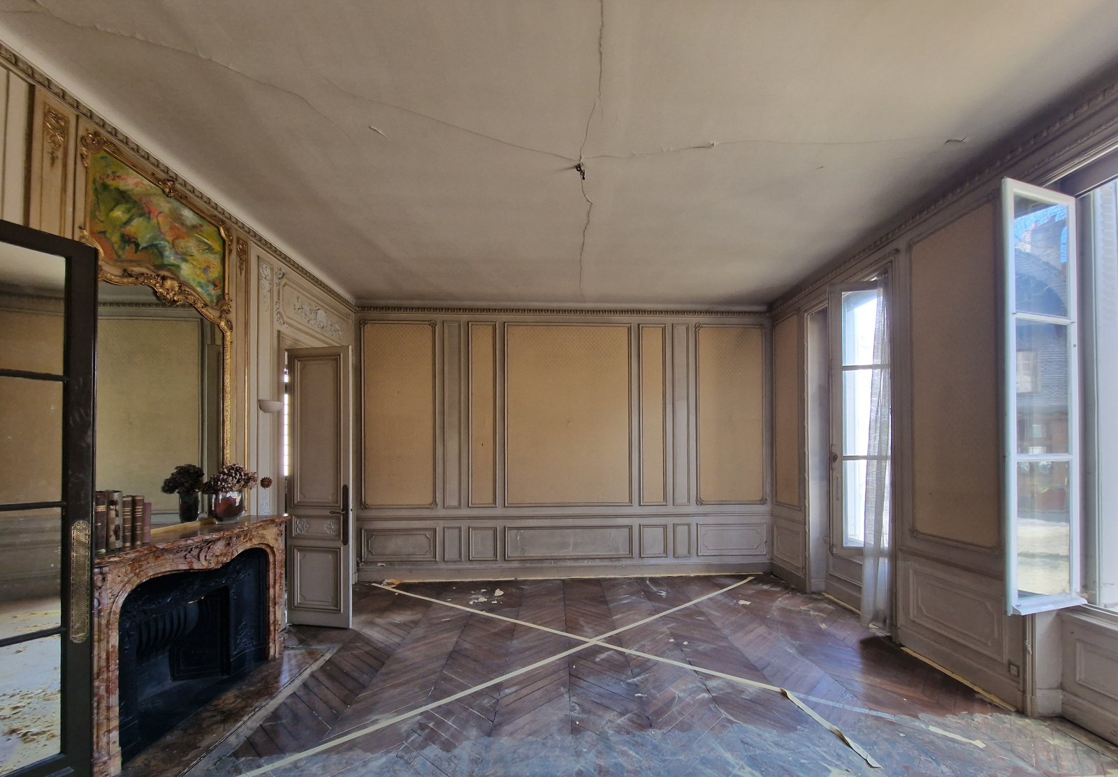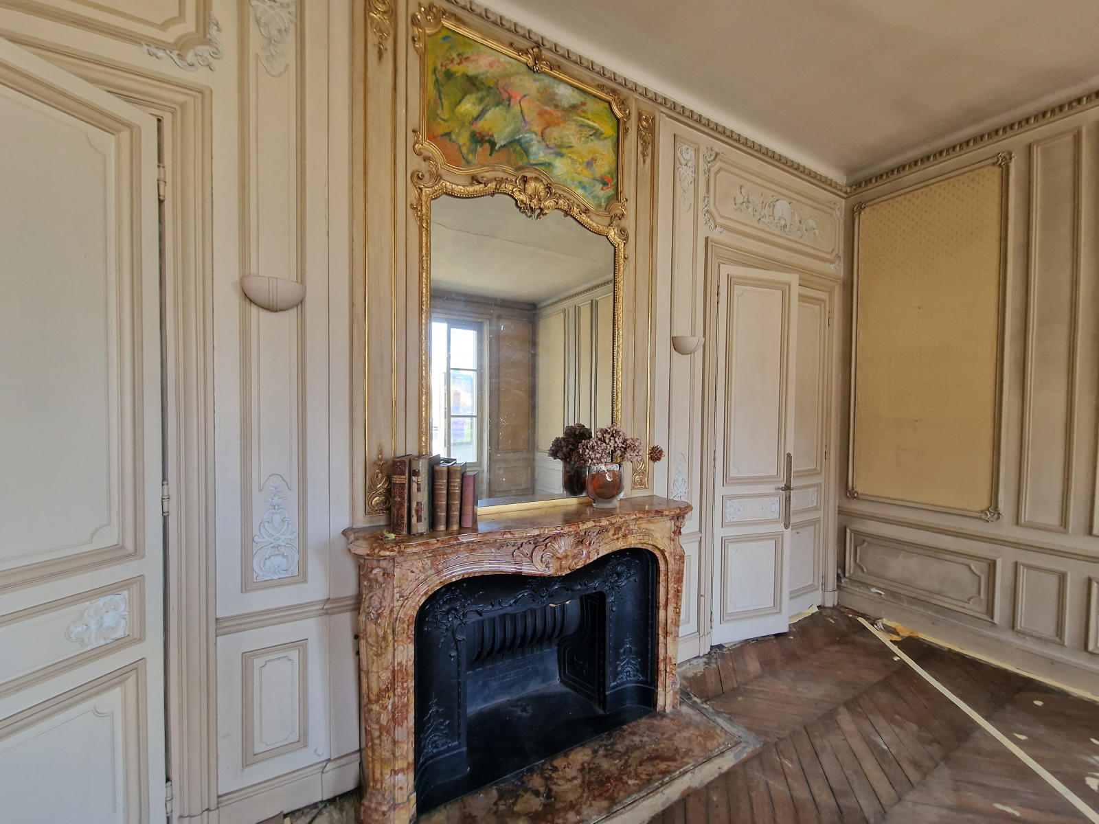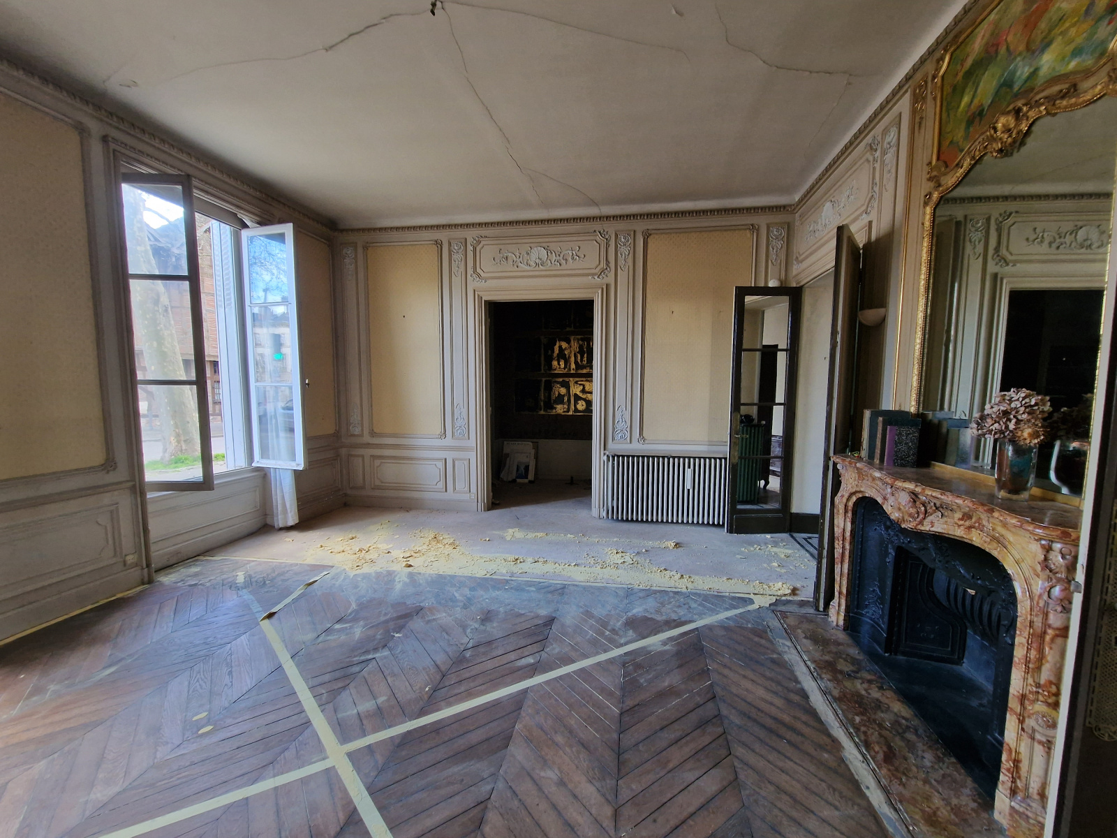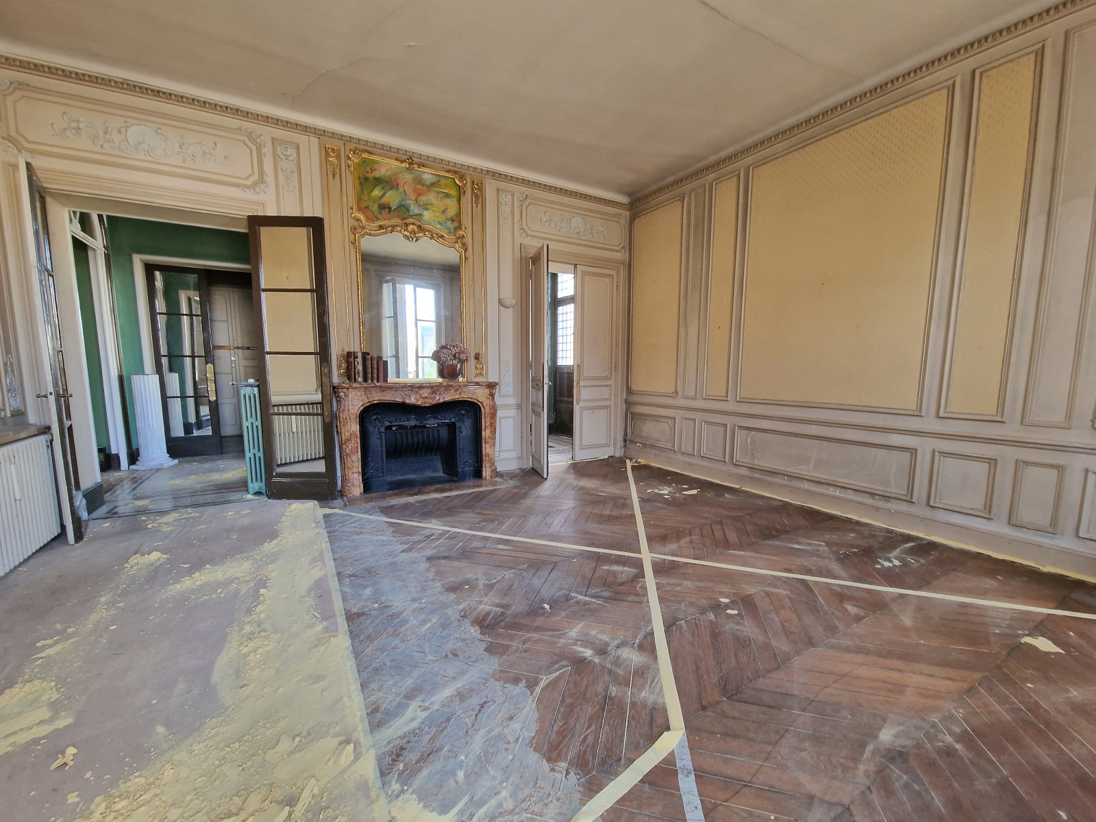 Parquet point de Hongrie, sol en marbre, moulures, cheminées.