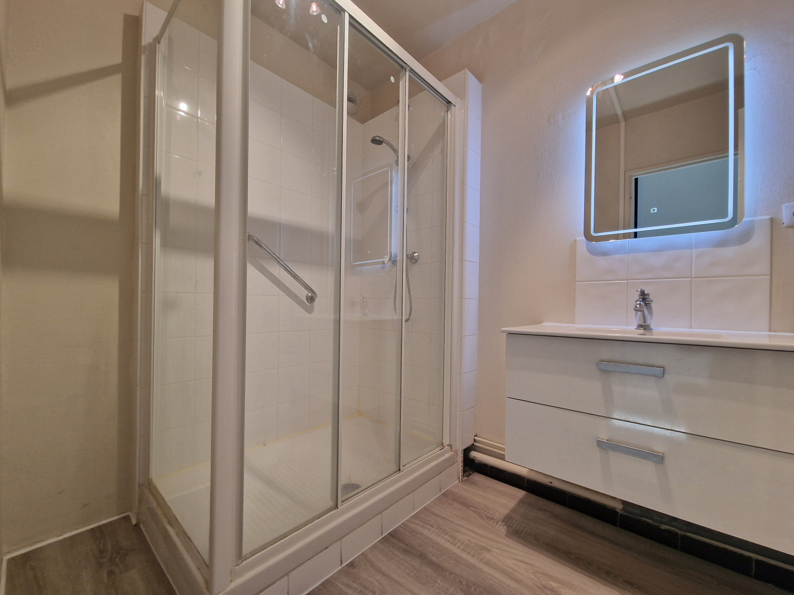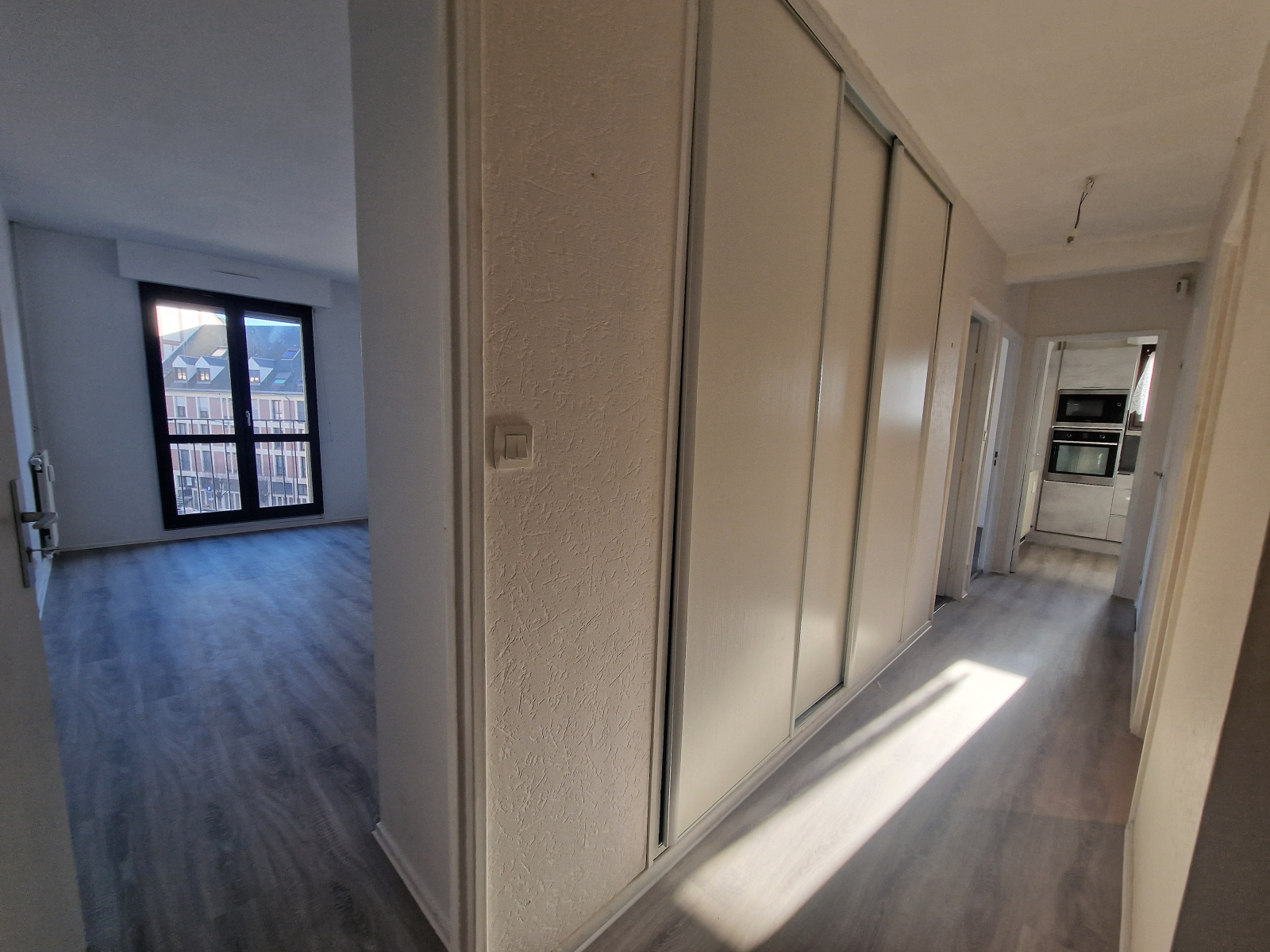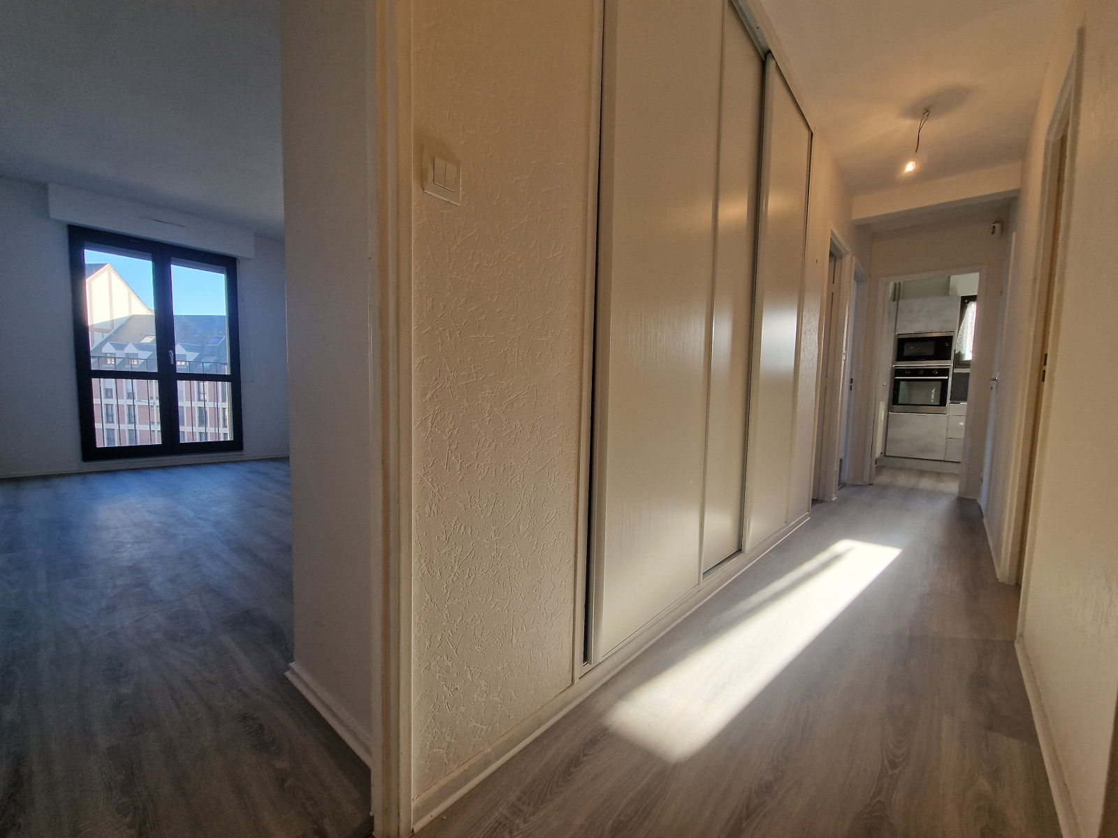 Vaste entrée lumineuse avec linéaire de penderies et de placards, une cuisine aménagée et équipée, un séjour double de 28m² offrant, si besoin, la possibilité d'être recoupé pour offrir une chambre supplémentaire, une chambre de 13m², une salle de douche avec meuble vasque et miroir LED, et une buanderie équipée d'étagères et de branchements ainsi que d'évacuations pour machine à laver et/ou sèche linge.