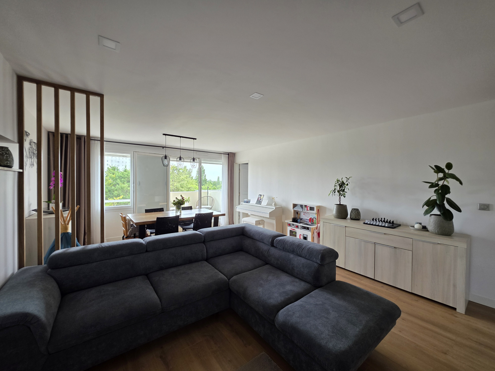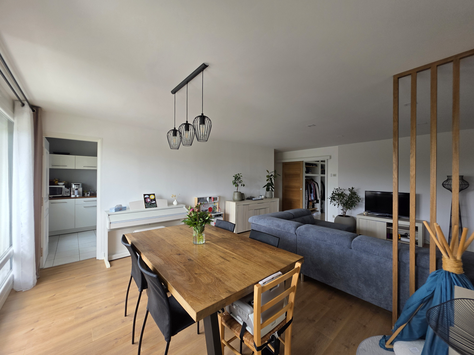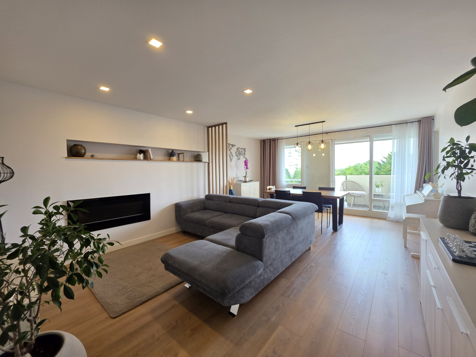 Pièce de vie baignée de lumière de près de 30m² avec cheminée électrique et jolie terrasse, cuisine aménagée.