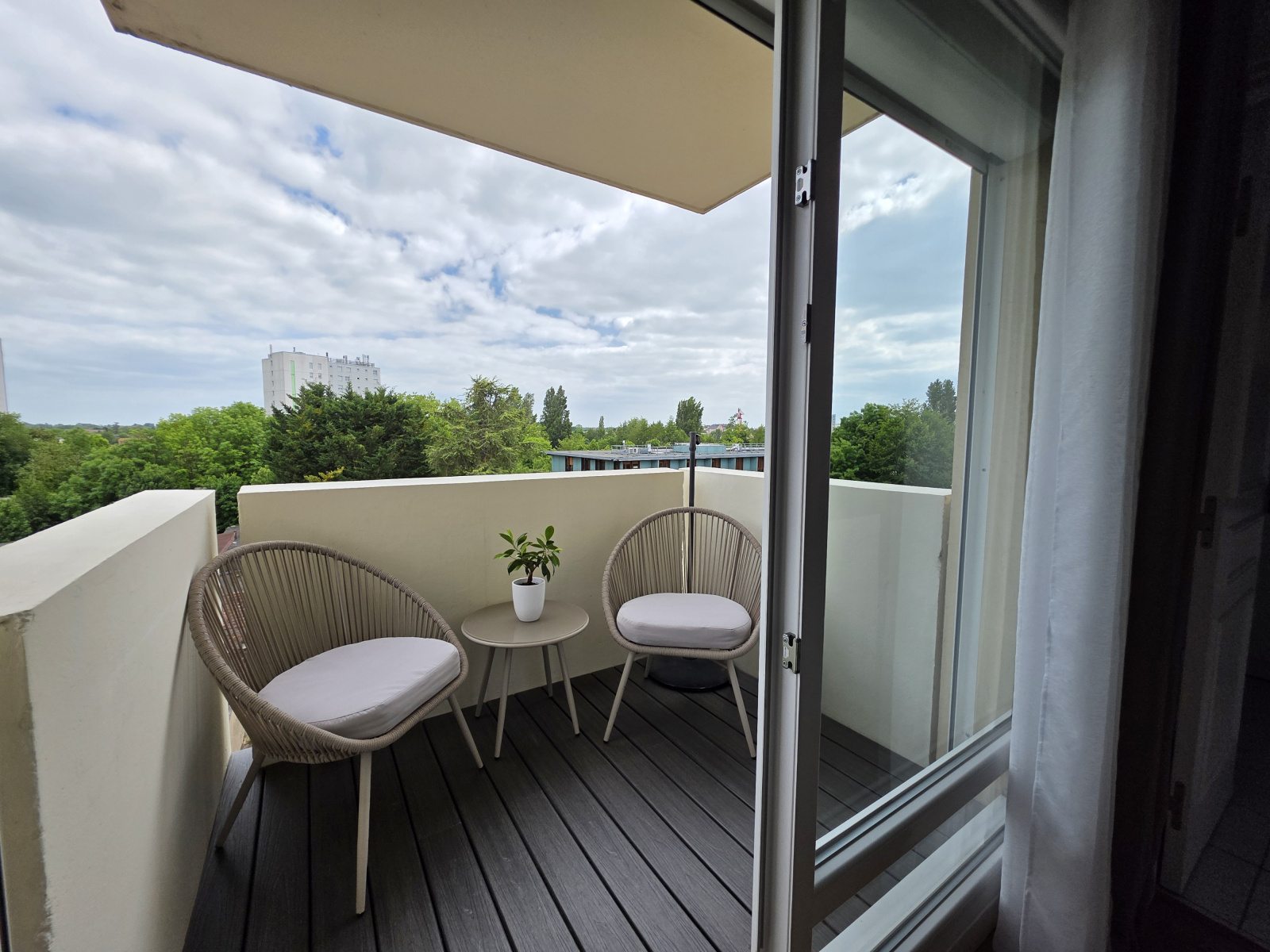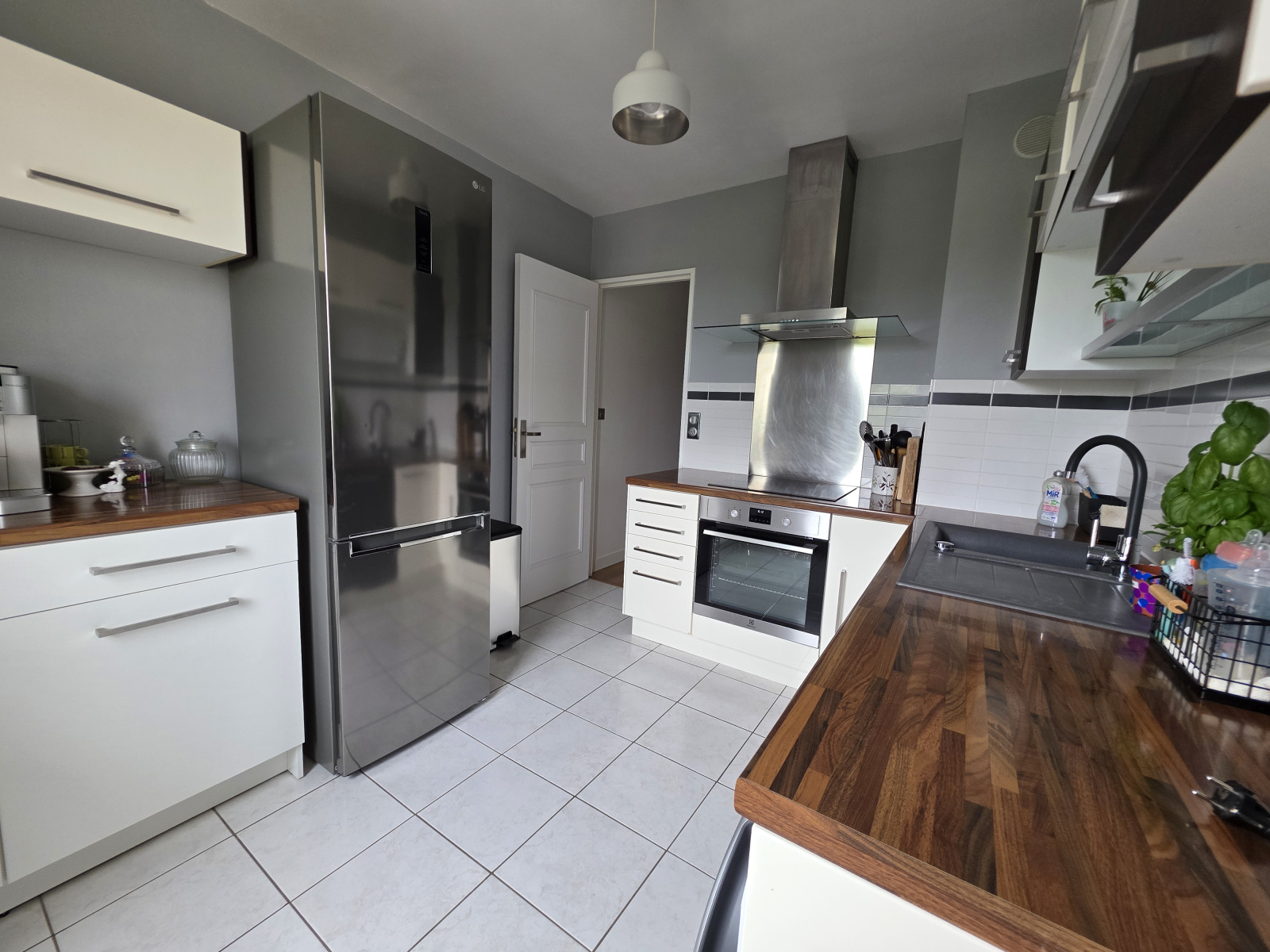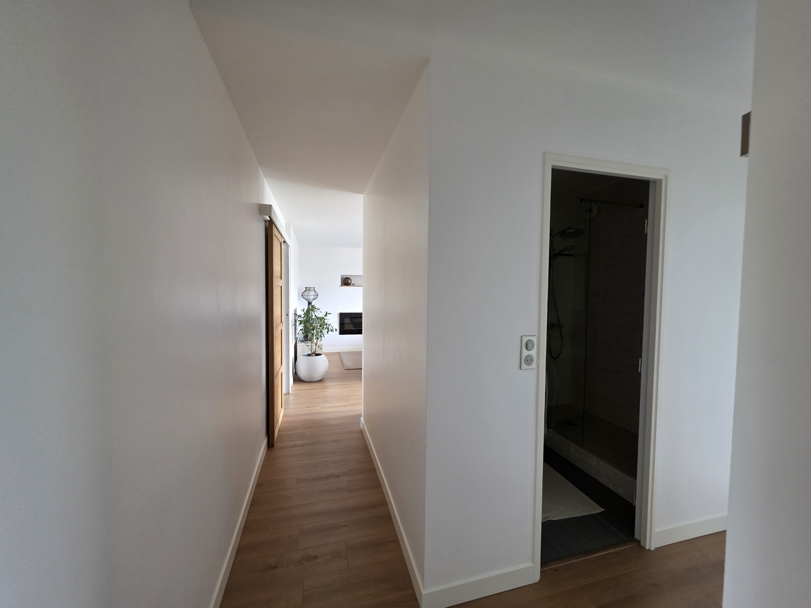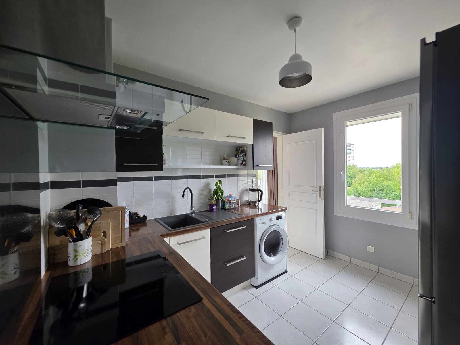 Pièce de vie baignée de lumière de près de 30m² avec cheminée électrique et jolie terrasse, cuisine aménagée.