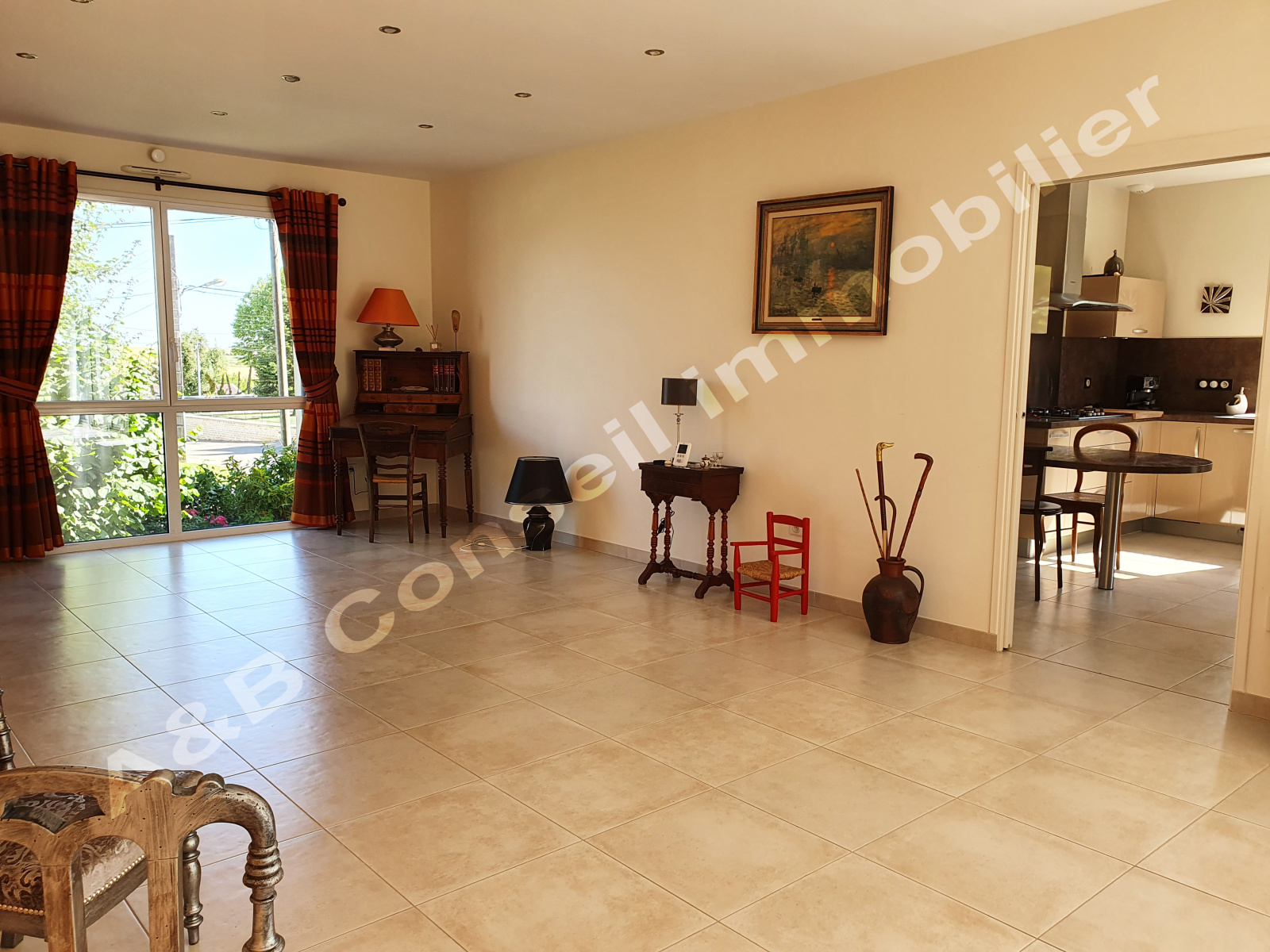 De plain pied: grande pièce de vie lumineuse de près de 60m² avec insert offrant un accès direct sur l'extérieur par de large baies vitrées, cuisine avec cellier attenant, une chambre avec salle d'eau, wc et dressing. Un espace nuit offre une salle de bains ainsi que deux chambres supplémentaires avec chacune un placard. Un bureau peut facilement faire office de quatrième chambre.